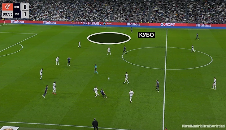 Альгуасиль придумал для Такефусы новую роль – оттянутый форвард: при гибридных 4-4-2 японец занимал место возле Александра Серлота, но не был скован в движении и регулярно менялся позициями с Давидом Сильвой. Тот запускал весь ромб – вперед выдвигался кто-то из пары Микеля Мерино и Браиса Мендеса, помогая Кубо не только в атаке, но и в прессинге.