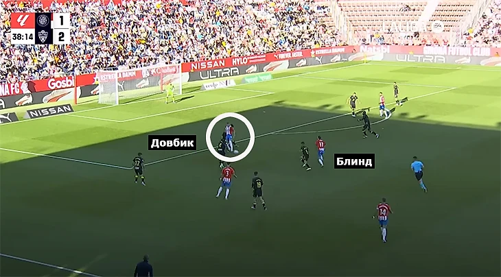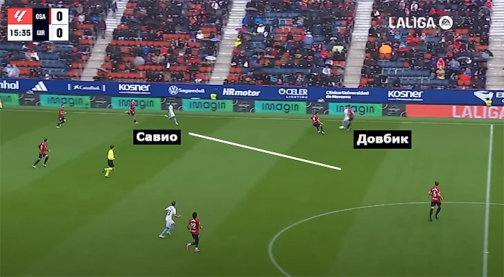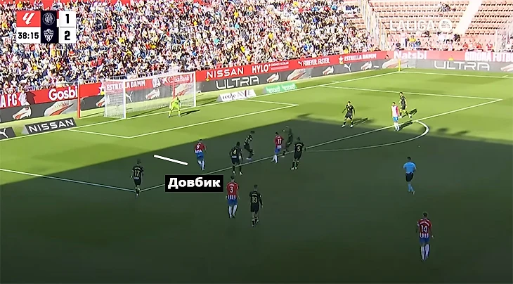 Контратаки – еще одно оружие «Жироны». Артем тоже полезен: умеет придержать мяч в ногах, пока партнеры врываются в его зону.