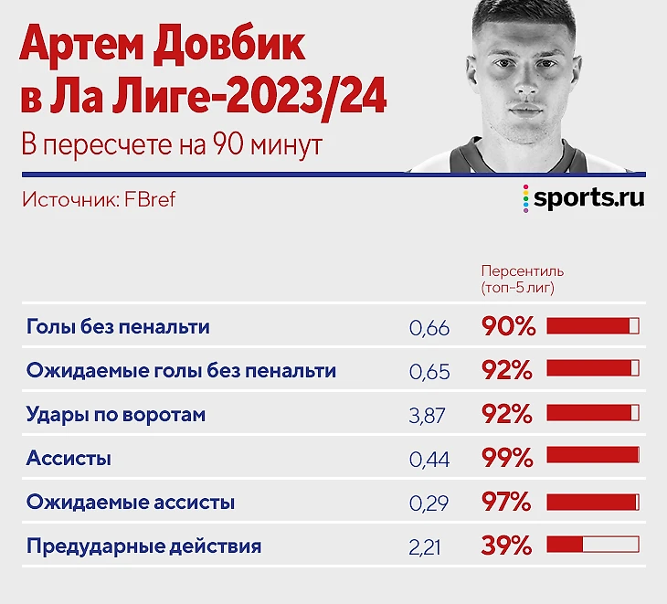 Если перевести цифры Довбика в персентили (модель, которая показывает статистику в рейтингах как в футбольных симуляторах), то окажется, что украинец – топ по основным показателям, ограничен только в предударных действиях.