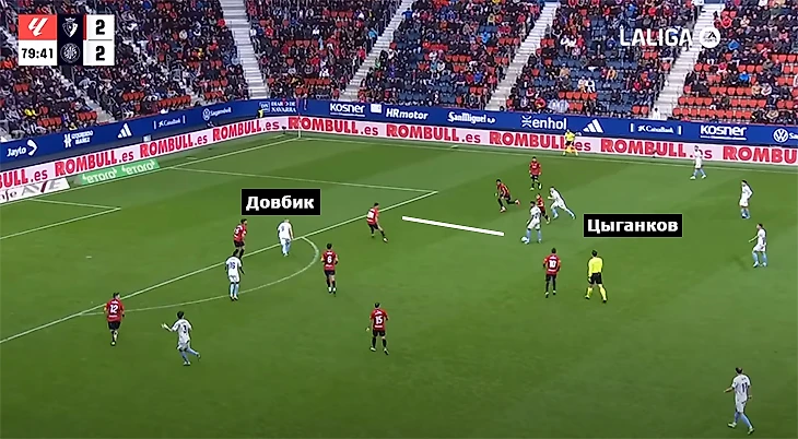 С форматом Цыганкова, например, проще взламывать низкий блок. Когда «Осасуна» закрылась, помогли именно движения Виктора. Перед третьим голом он сместился в центр, отдал пас и пошел вперед.