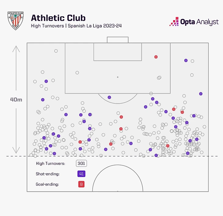Силу баскского давления можно выразить и так: «Атлетик» в этом сезоне Ла Лиги чаще всех совершает возвраты мяча на чужой трети поля, рядом лишь «Севилья». Каждый седьмой завершается ударом по воротам.
