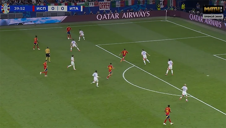 27-я минута. Очередная атака испанцев: навала нет, в штрафной всего три человека. А вот итальянцы сели почти полностью: только Лоренцо Пеллегрини пошел на Фабиана Руиса – и где-то вдалеке одинокий форвард Джанлука Скамакка.