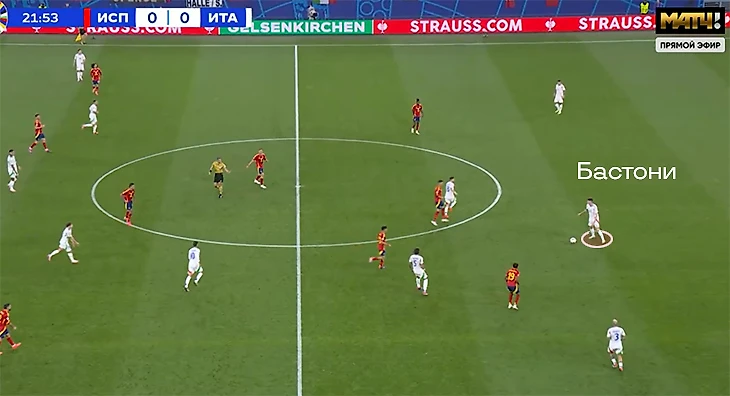 Италия пыталась играть смелее, выйти из-под фантастического прессинга Испании. Но Жоржиньо не пасовал вперед, не видел вариантов. И даже Алессандро Бастони, один из самых ярких защитников продвижения, пасовал Джиджи Доннарумме.
