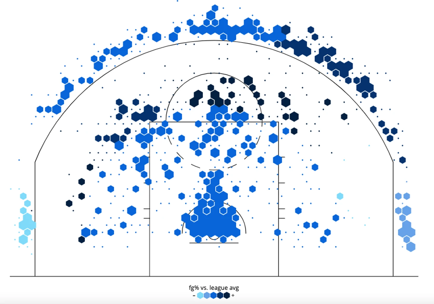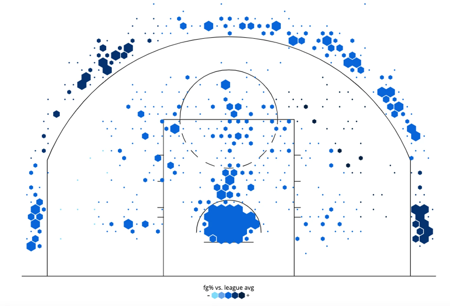 Что на самом деле должно вас пугать, так это то что за год здесь произошел регресс в плане распределения бросков при наличии Адамса и Хэйса, которые вообще не умеют бросать и ошиваются около кольца. Зайон все равно лез в краску и это неплохо, учитывая цифры Уильямсона и то, как он с этим справляется, но немного настораживает.