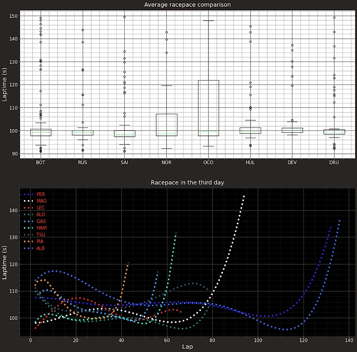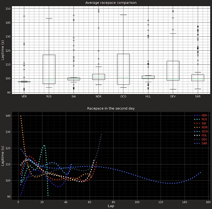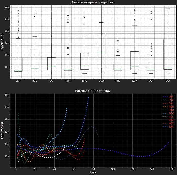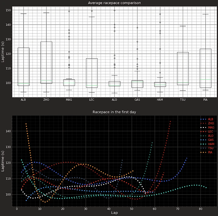 На верхней слада мы видим результаты оставшейся части гонщиков в первый день. Точками показаны выбросы, а на нижней части показана динамика времени на тестах в течение первого дня тестов.