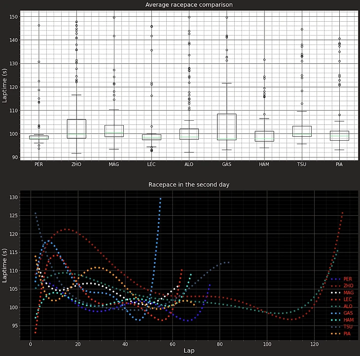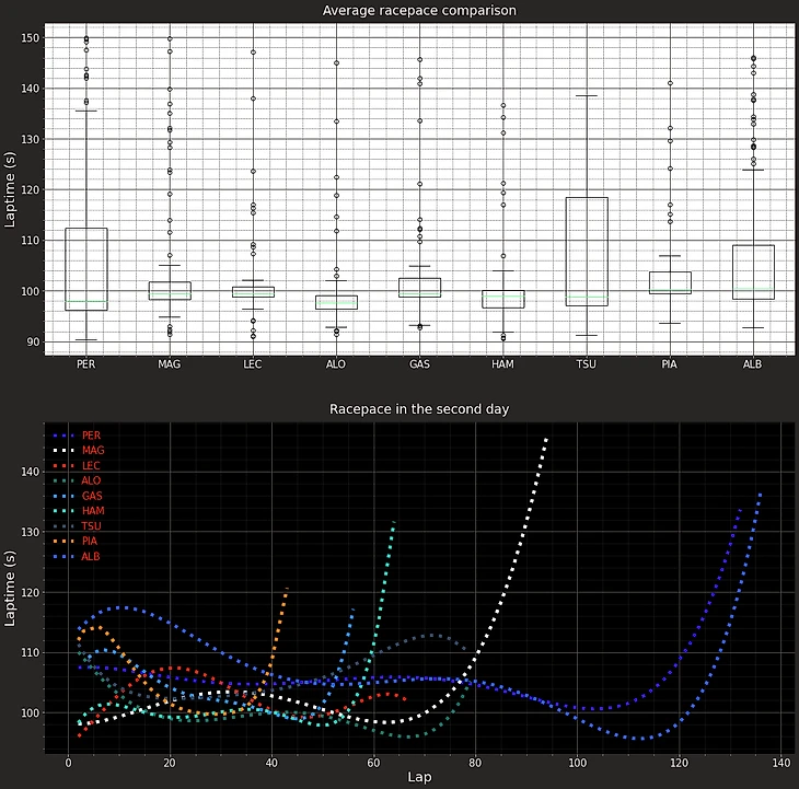 На верхней слада мы видим результаты части гонщиков во второй день. Точками показаны выбросы, а на нижней части показана динамика времени на тестах в течение первого дня тестов.