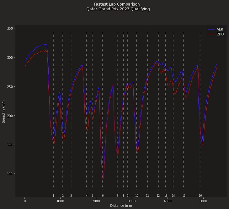 Сравним лучшие круги в квалификации Гран-при Катара 2023 года (в этот раз сравним круги обладателя поул-позиции и гонщика, занявшего последнее место в квалификации ) Макса Ферстаппена, а также Чжоу Гуаньюй. Их разделила просто пропасть - 3,564 сек. в квалификации.