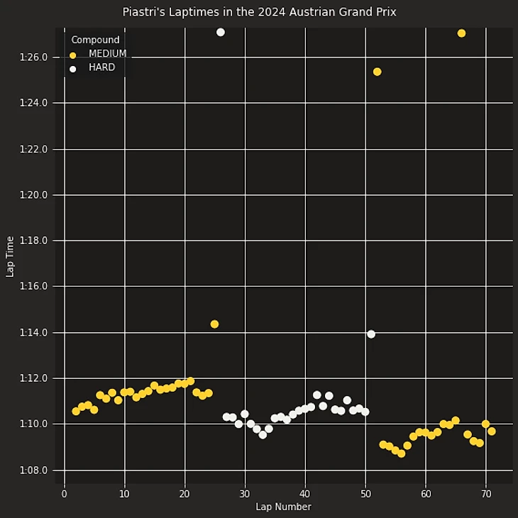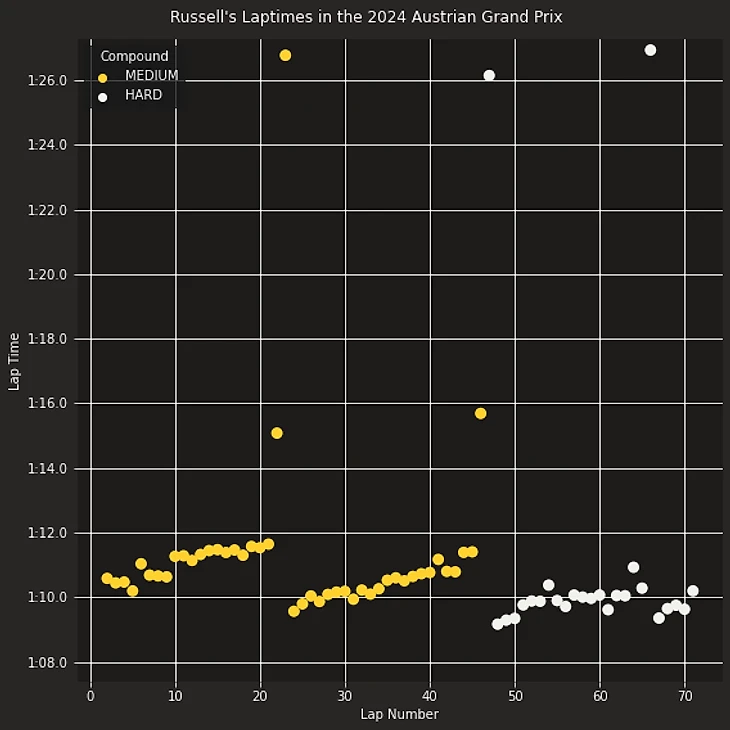 Нанесем на график время прохождения круга призеров Гран-при Австрии 2024 Джорджа Расселла (победителя), Оскара Пиастри (занявшего второе место) и Карлоса Сайнца (занявшего третье место) в гонке с учетом типа шин.