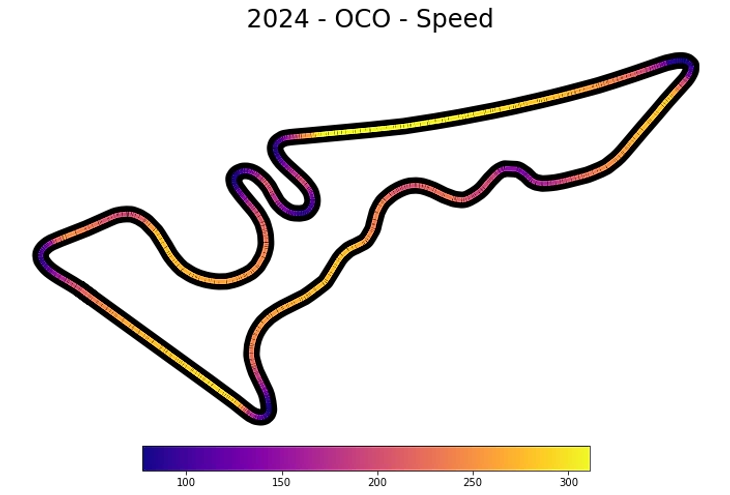 Возможно последний быстрый круг в карьере Эстебана Окона, установленный на Гран-при США. Визуализируем распределение скорости на этом самом круге.