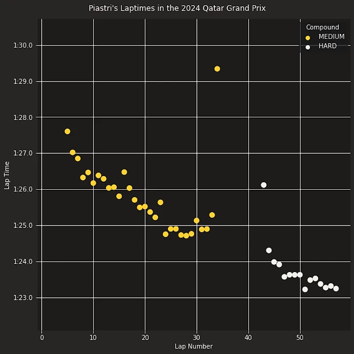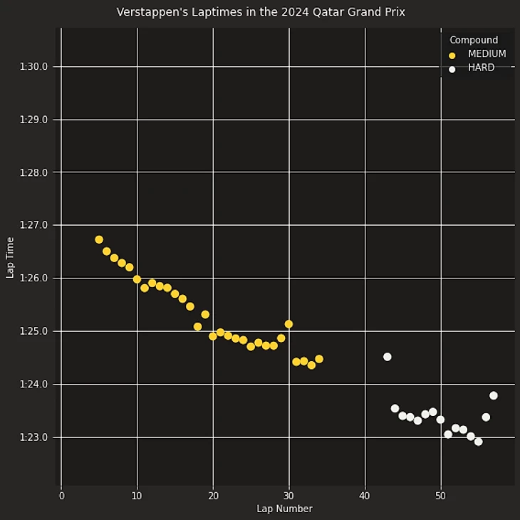 Нанесем на график время прохождения круга призеров Гран-при Катара 2024 Макса Ферстаппена (победителя), Шарля Леклера (занявшего второе место) и Оскара Пиастри (занявшего третье место) в гонке с учетом типа шин.
