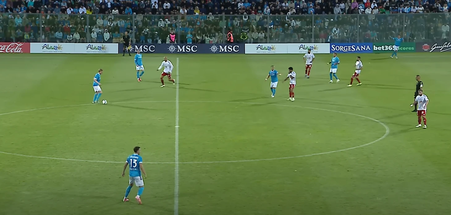 • Ну а переход Де Брюйне — попросту чит-код. В товарищеских матчах Кевин играл в свободной роли на подобии той, что исполнял Фабрегас в «Челси». Де Брюйне сам решает, когда и из какой зоны ему действовать. Как пример — вот позиция, из которой Кевин разогнал голевую атаку «Наполи» длинной передачей на Ди Лоренцо в штрафную.