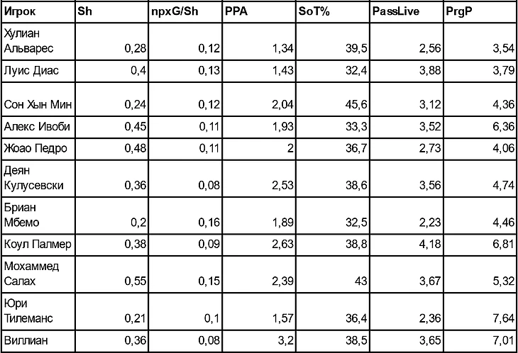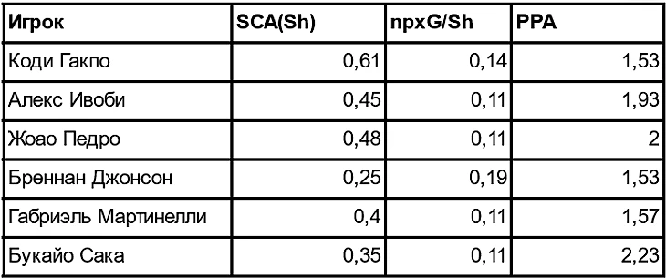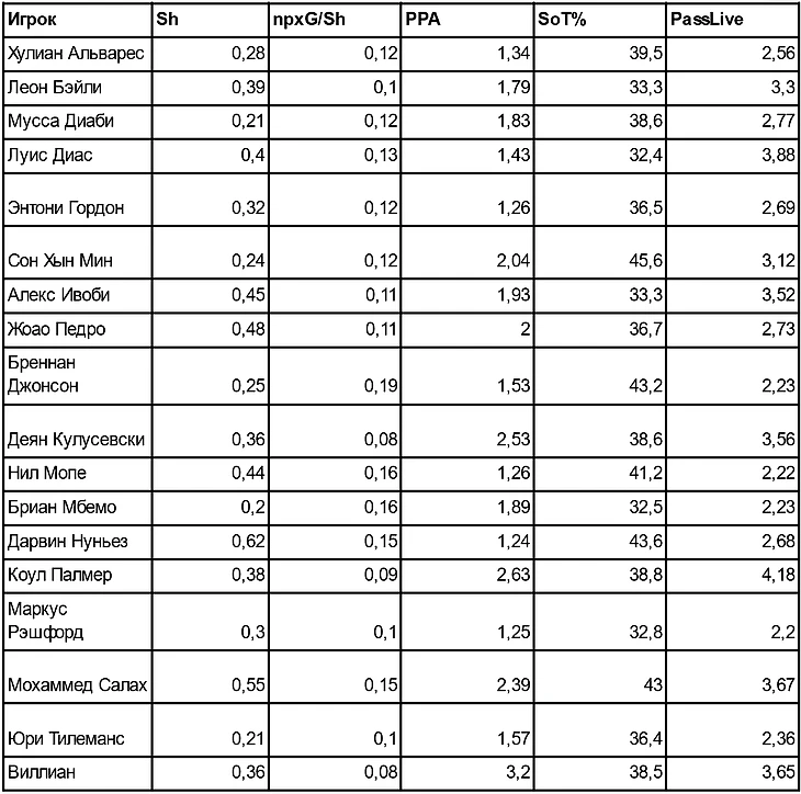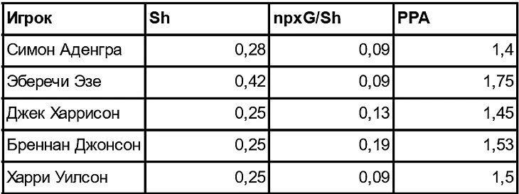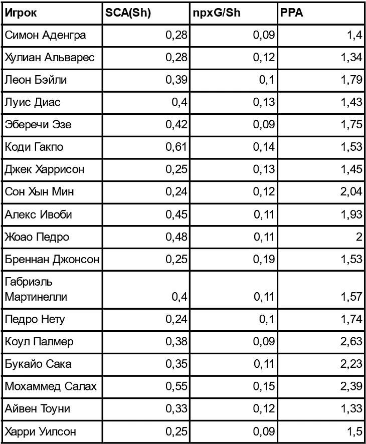 Мда, все ещё не манибол. Лично для меня совсем неожиданным оказался Бреннан, но этого мало для того, чтобы можно было принять взвешенное решение. Игроков, чьи показатели SCA(Sh), npxG/Sh и PPA выше средних по лиге, всего 7(Салаха я вручную удалил из этого списка).