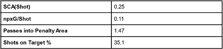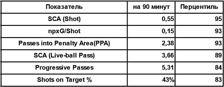 опасен не только ударом(npxG/Shot + Shots on Target %), но и его последствиями(SCA(Shot))
