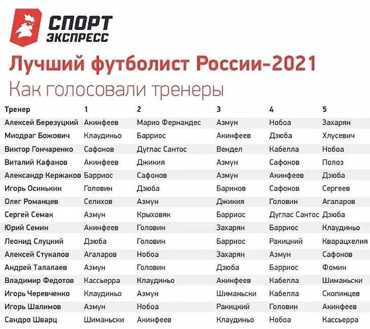 Как же так вышло, что голосование на спортсе выглядит более адекватным, чем на СЭ? Ответ прежде всего заключается в том, что Дорский грамотно отобрал номинантов, опираясь на объективные статистические данные. Да, эта все равно его личная пятерка, но она подкреплена реальными фактами, которые он еще и написал в посте, чтобы болельщики смогли сами оценить по ним номинантов. Да, это не всегда сработает, но во-первых, все кандидаты здесь по делу, пятерка априори выглядит более-менее справедливо, а во-вторых, если вы болеете за клуб, представителя которого нет в списке претендентов, то сможете сделать объективный выбор через призму статистики. Конечно всем очевидно, что на 100% быть объективным нельзя, но стремится можно. На "СЭ" же голосуй хоть за Рассказова, что и сделал один из журналистов, красноречиво показав проблему их опроса. Да и стоит отметить голосование тренеров. Могу долго расписывать про желание поощрить своего игрока, политкорректность, но просто приведу вам вот такие факты: из 16 наставников 7 назвали лучшим игроком года игрока из своей команды, а 11 включили хотя бы одного из них в топ-5 (ну только добавлю, что "Спартак" и "Локо" представляли не нынешние наставники, а Романцев и Семин, но это конечно не меняет картину). Окей, ладно Семак, Шварц, Федотов ставят своих, но почему Лео Слуцкий, который совсем недавно жестко критиковал Хвичу, завалившего осень поставил его в пятерку лучших? А угадайте, кто поставил в тройку Джикию, а на первое проведшего несколько игр за год Селихова?