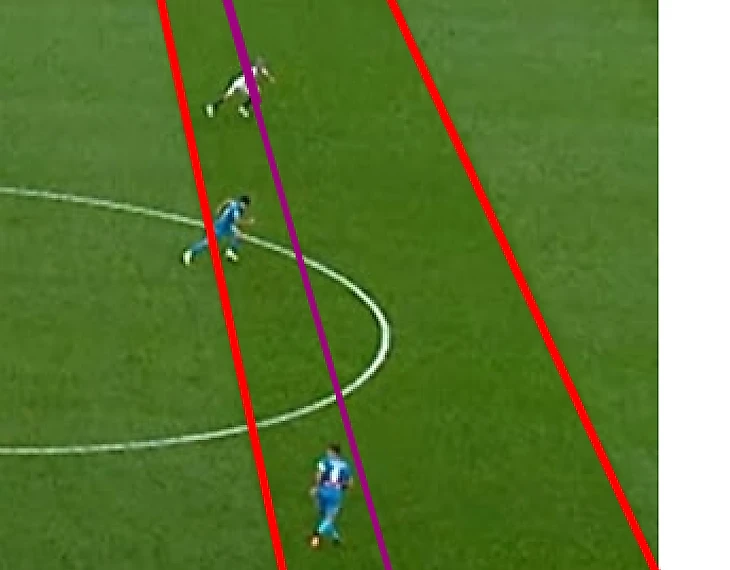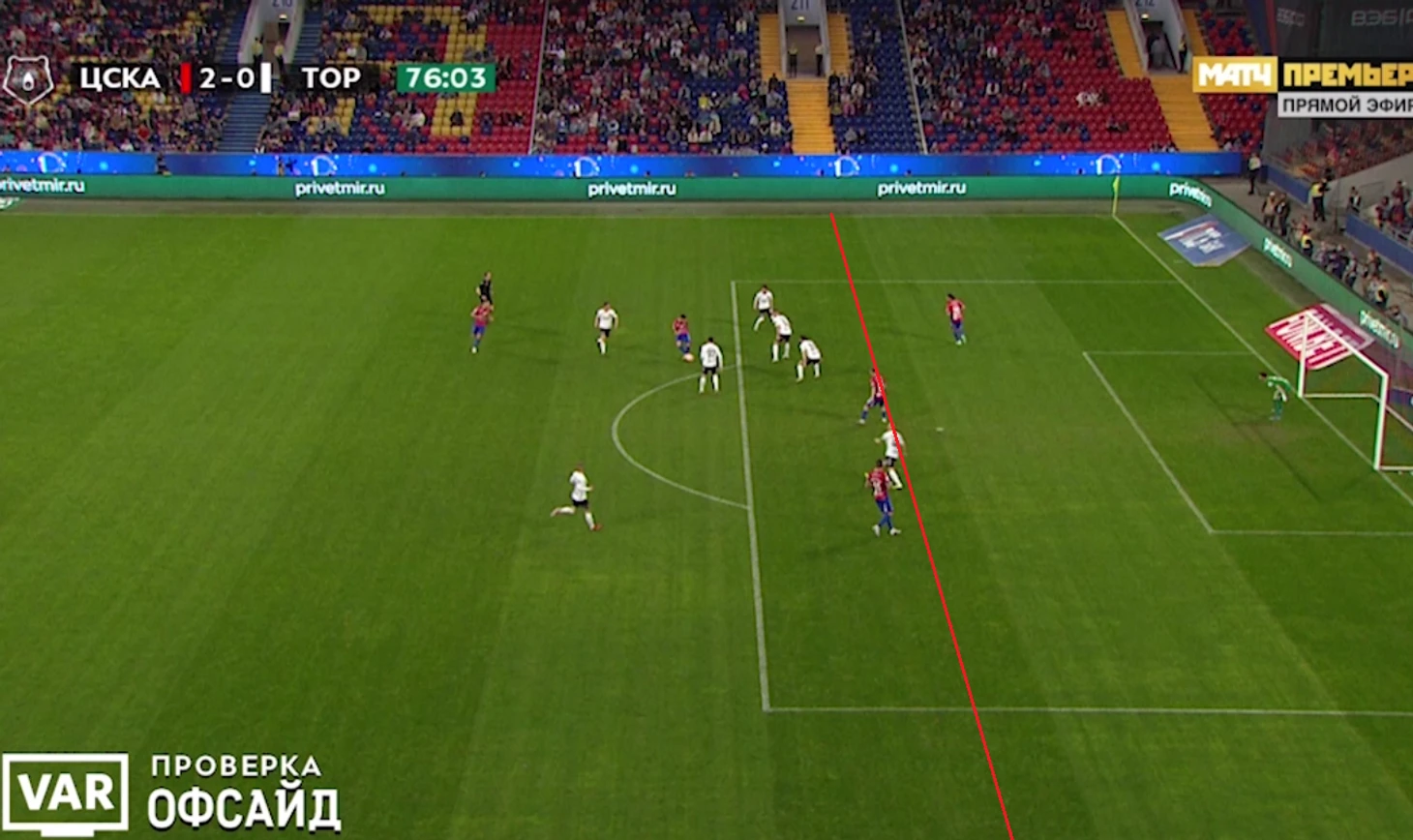 Причем это тот случай, когда определять офсайд у Облякова стоит не только по ноге, но и по туловищу - настоящий кошмар для арбитров, потому что надо не просто разглядеть, вышло ли плечо за линию, но и четко определить, где это плечо заканчивается и начинается рука. Как вы видите, рука защитника «Торпедо» будто бы чуть дальше (и то, не забываем про неидеальный ракурс), а вот насчет плеча такого сказать нельзя. За последние годы у нас бывали случаи, когда мяч попадал в область, где обычно заканчивается рукав футболки, после чего в сети начинались яростные споры. А тут нужно с общей камеры определить, находится ли спина Облякова на одной линии с плечом соперника. Проще говоря - миссия невыполнима.