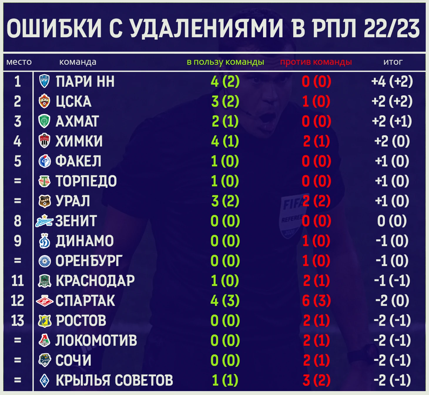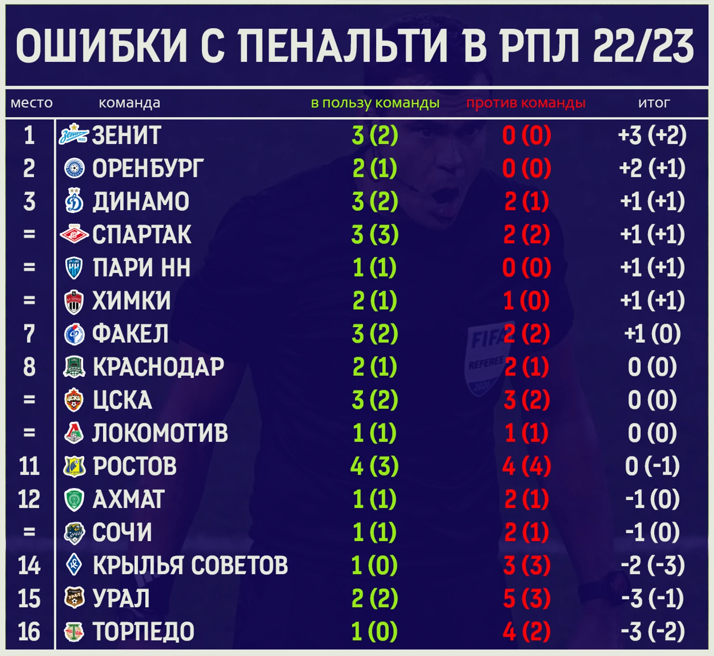 Ещё из интересного - большой плюс для «Пари НН» и ноль ошибок в матчах с участием «Зенита». Впрочем это лишь удаления, теперь глянцем пенальти: