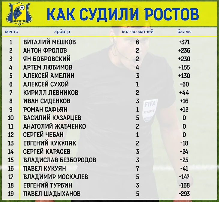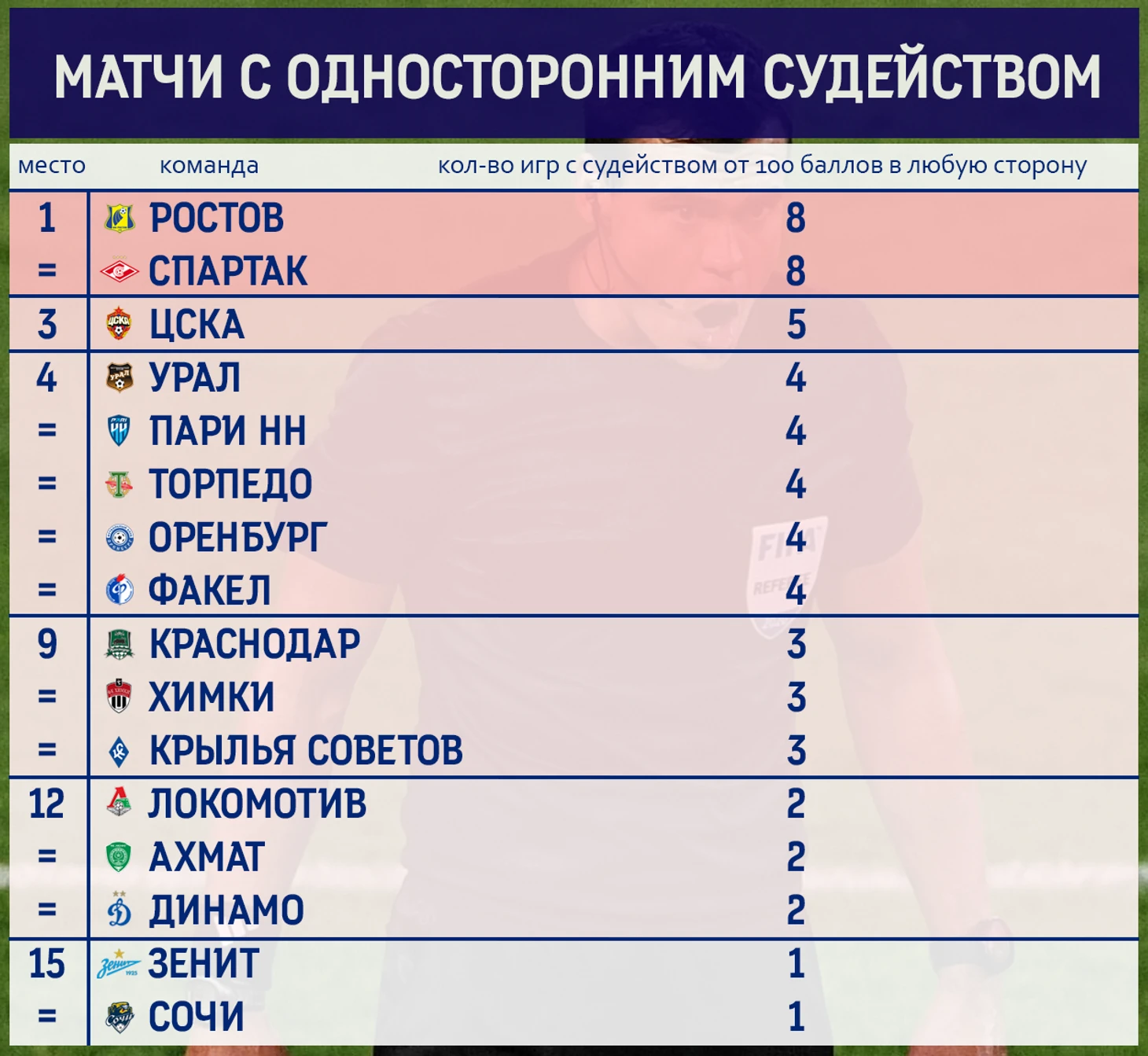 По ходу исследования я замечал, что и среди болельщиков фокус часто падал на тему судейства «Ростова». Ка будто именно их считали главным выгодополучателем судейских ошибок, тут и вспоминаются падения Комличенко, которые утомили многих. И с одной стороны это все вроде подтверждается моей таблицей, но вы уже понимаете, что 457 баллов за весь сезон - это совсем не критично. Давайте разбираться, как вышла такая оценка.