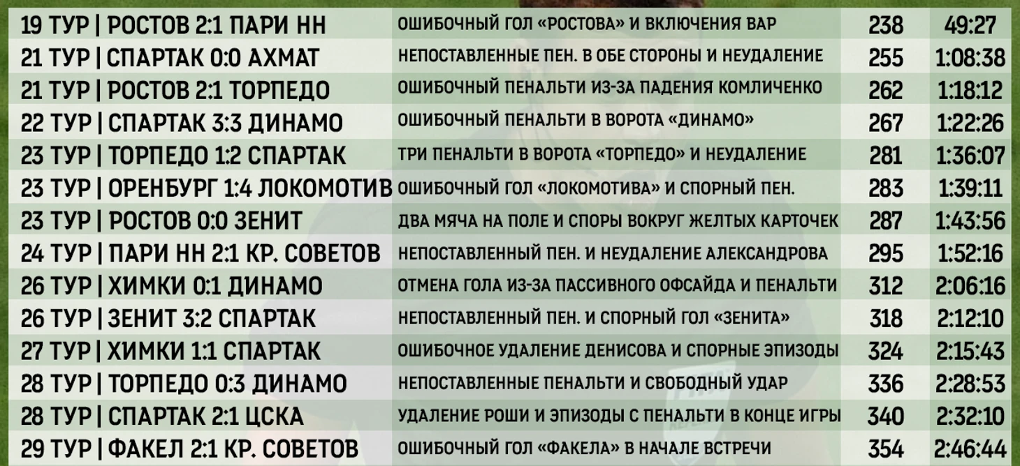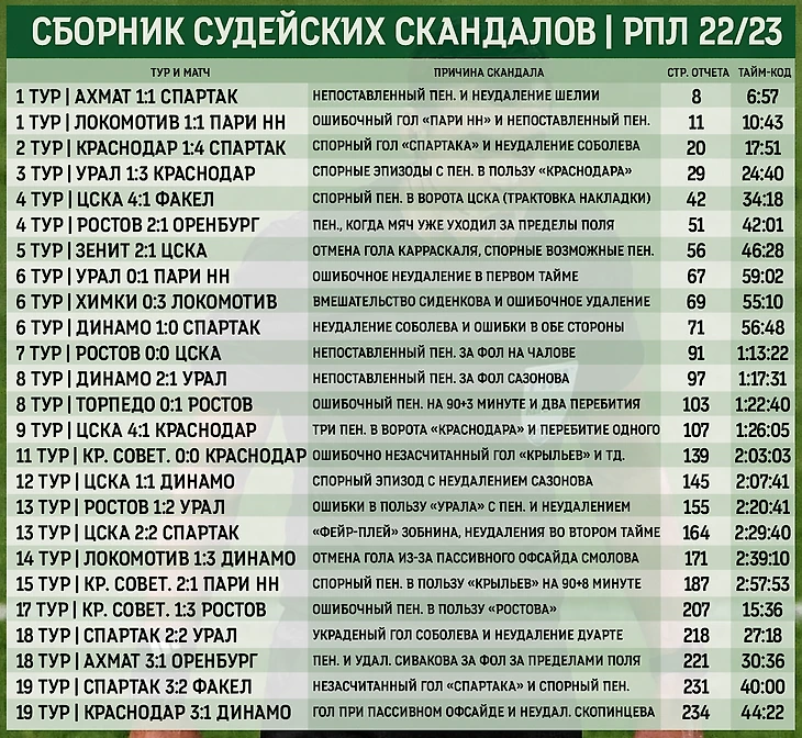 Как вы можете видеть по названию этой статьи, цель минимум (зафиксировать каждую ошибку) удалось выполнить. Да и в целом, работа над данным проектом позволила сделать о нашем судействе много любопытных выводов, которыми хочется поделиться с как можно большим количеством читателей. Впереди вас ждёт большая статья с графиками/таблицами и детальным разбором нашумевших эпизодов прошлого сезона. Вспомним много всего, в том чилсле бесконечные падения Комличенко и скандалы вокруг матчей «Спартака». Ну а вишенкой на торте станет 400-страничный отчёт и два трехчасовых видео с каждым рассмотренным эпизодом в динамике, чтобы вы не подумали, что все это было взято из головы. Поехали!