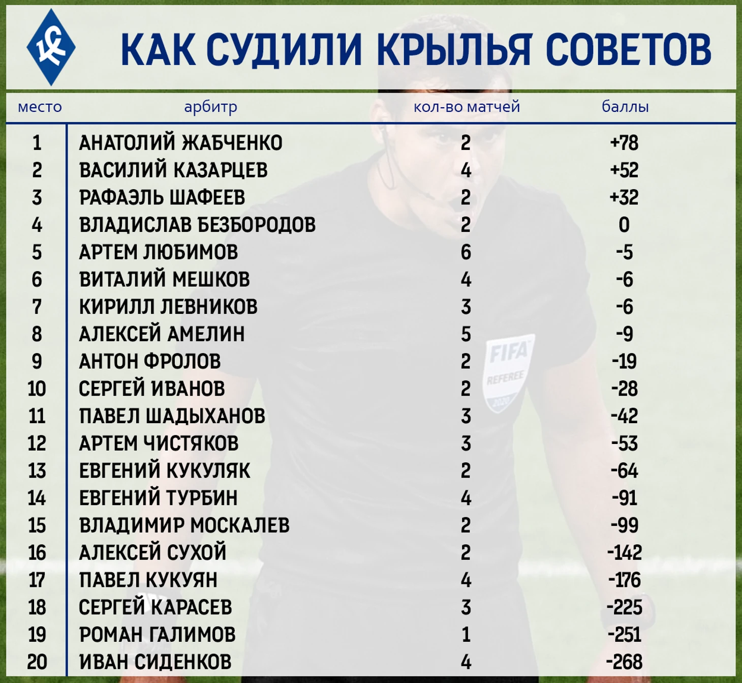 Что интересно, ошибались с «Крыльями» едва ли не все, баллы распределены настолько равномерно, что больших претензий у самарцев может быть совсем к немногим, да и то, даже среди тех, кто наошибался на -200 и более, я не видел целенаправленного топления «крылышек», к примеру тот же Иван Сиденков за 4 игры, помимо плохой работы на ВАР с «Нижним» имел качественную игру в поле в матче с «Динамо», где закономерно отменил сразу три гола.