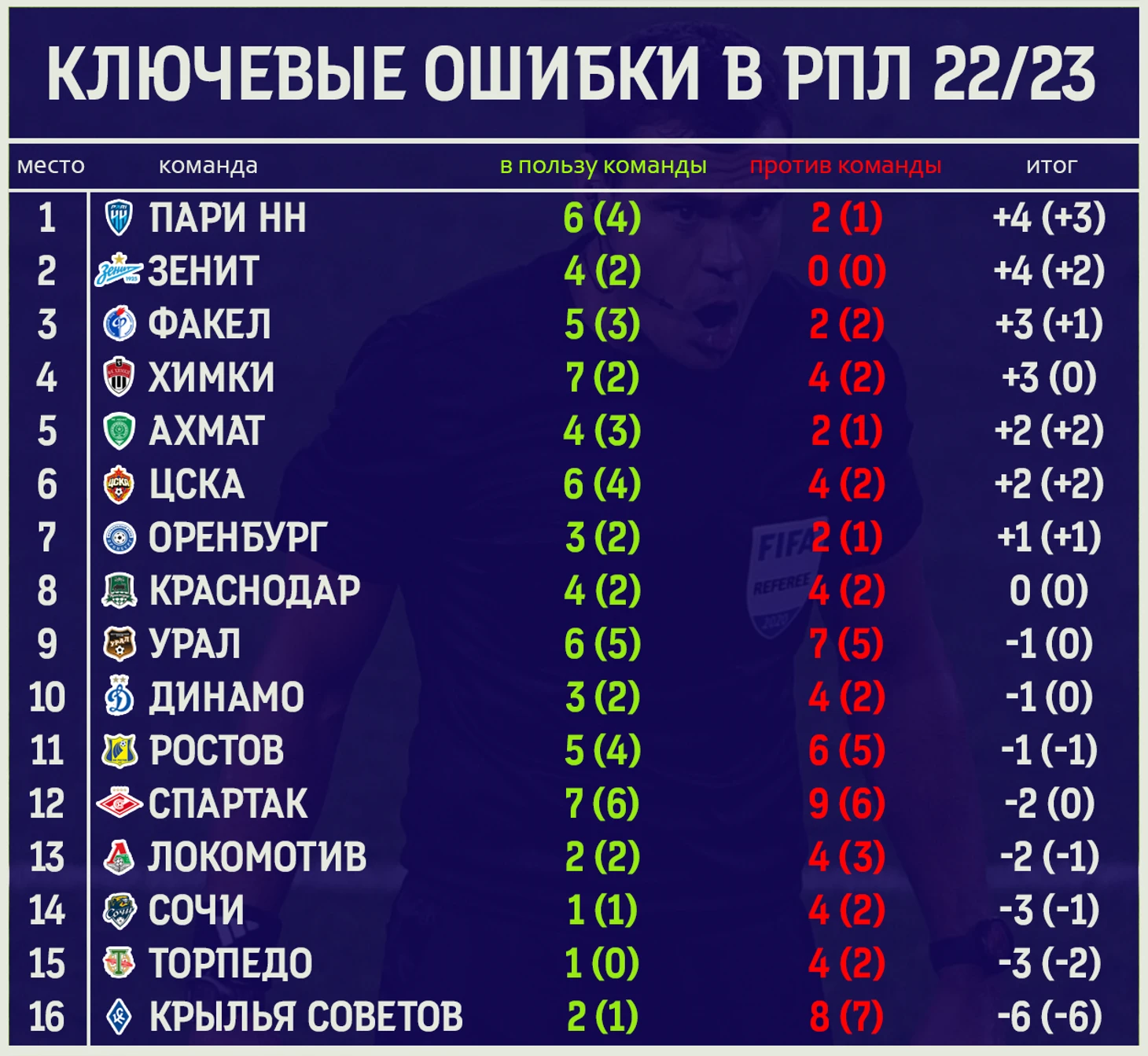 Ожидаемо, «Спартак» лидирует по всем возможным критериям, и в свою сторону, и в чужую, и по общему числу и по тем, которые повлияли на исход. Кстати о последнем, примечательно, что 2 из 3 ключевых ошибок в пользу красно-белых связаны с неудалением Соболева.