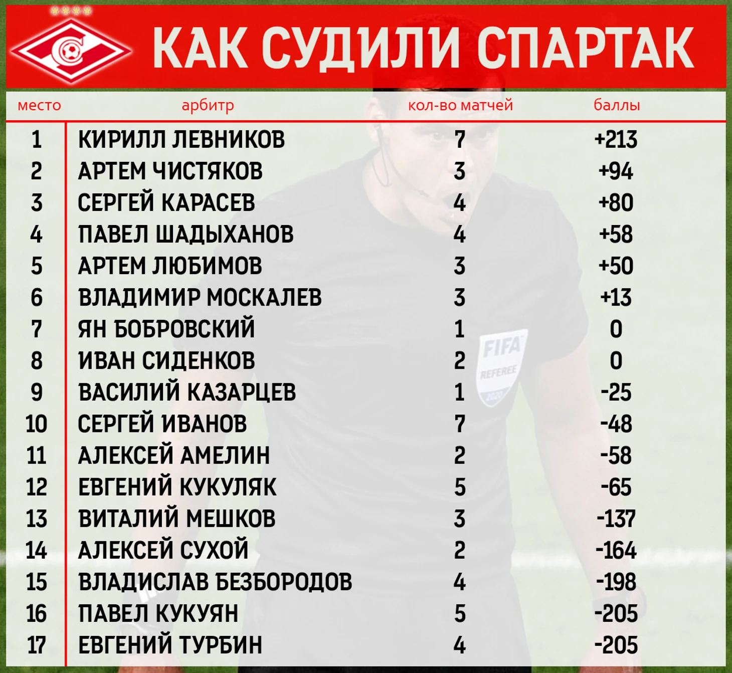 Ожидаемо внизу Безбородов, за матч в Грозном и с «Факелом», также внизу Кукуян, за матч с «Зенитом», а Турбин, который в течение всего сезона образцово работал на ВАР, сгорел в игре с «Ахматом». Больше всех матчей у Иванова и Левникова. Любопытно, что мне доводилось примечать, как болельщики красно-белых их недолюбливают, Иванова видимо за игру с «Зенитом», а Левникова - просто потому что питерский. Но как мы увидели, первый ошибался и в пользу «Спартака», а второй как раз судил ту скандальную игру с «Краснодаром» годичной давности.
