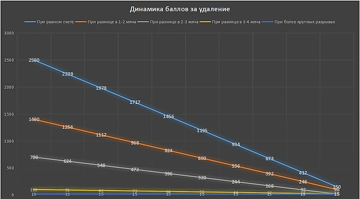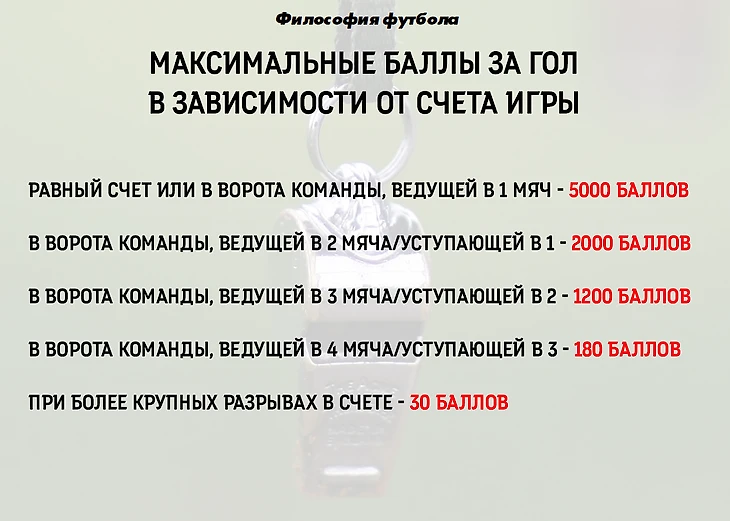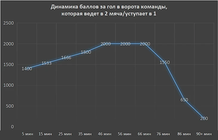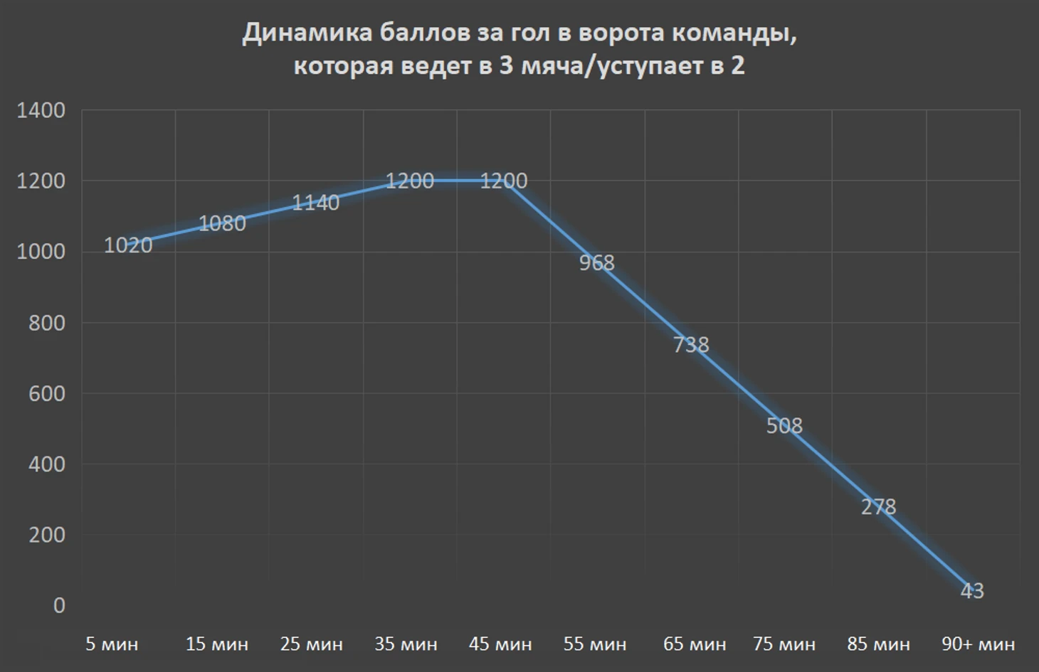 Отмечу, что показатель в 1200 баллов был взят, потому что он чуть ниже количества баллов при минимальной разнице в счёте в начале встречи, это такое абстрактное правило, основанное на собственной логике, но иначе тут нельзя. Тем не менее здравый смысл здесь есть, если вы сравните максимумы баллов за голы при равном счёте, разнице в 1-2 и разнице в 2-3 гола (5000-2000-1200), то заметите, что наибольший разрыв между первыми двумя показателями, а дальше он значительно меньше. Проще говоря, чем крупнее счёт, тем меньше его влияние, просто сравните, когда гол забивается при 0:0 и 5:0, поэтому и тут есть определенная закономерность.