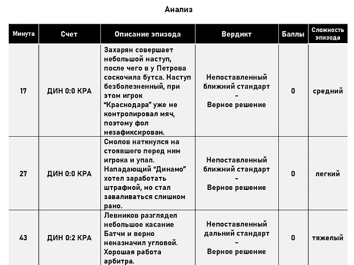 Теперь все разобранные моменты описаны не сплошным текстом, а так, чтобы все было интуитивно понятно. Отдельной отмечу графу «сложность эпизода», в предыдущем сезоне такой характеристики не было. На предвзятость к команде она никак не влияет и пока вы можете не обращать на нее внимание, она создана в первую очередь для того, чтобы отмечать правильные решение арбитров в сложных ситуациях. Раньше я на этом не заострял внимания, теперь же в отчёте будет много не только критики, но и похвалы, которую наши судьи тоже заслуживают. Вообще новое исследование будет больше заточено на самих арбитров, а не на их предвзятости к какой-нибудь команде, потому что эту самую предвзятость на дистанции всего сезона редко можно заметить. Я склонен предполагать, что причина большого количества ошибок в матчах РПЛ кроется в других вещах, а в каких именно - постараемся разобраться в этом сезоне и даже попытаемся создать свой рейтинг судей, который в отличие от рейтинга ЭСК будет учитываться каждая ошибка сезона и сложность эпизода, в котором она была допущена.