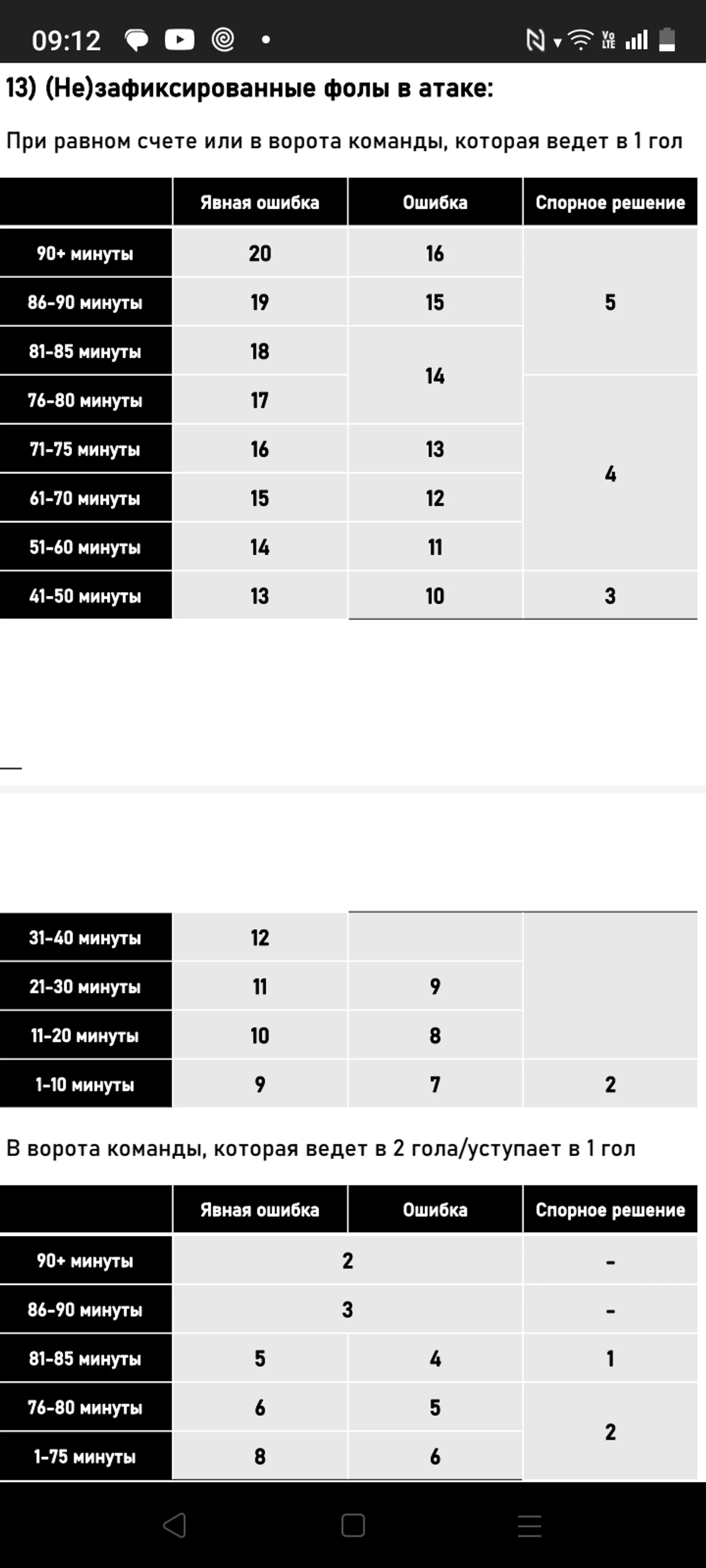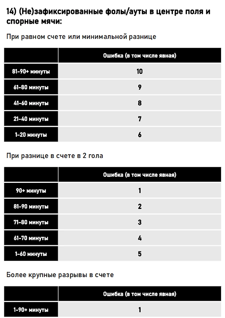 Здесь я сразу отмечу первое изменение в новой модели подсчета: теперь видов ошибок 14. Ничего совершенно нового здесь не появилось, просто некоторые виды были разделены. Раньше фол в атаке и фол в центре поля котировались одинаково, теперь нарушения в финальной трети со стороны атакующей стороны оценены чуть повыше, так как атака может потенциально привести к забитому мячу (или хотя бы угловому). Ещё одно нововведение - жёлтые для вратарей, они отдельно считались и в прошлом сезоне, но вместо таблицы с отдельными баллами была небольшое примечание: «баллы за жёлтую для полевого разделить на 2». Теперь карточки для вратарей проработаны более детально и отдельно от жёлтых для полевых, чтобы не возникало путаницы. К слову, ее было особенно много при оценке прерванных голевых атак - это особый вид ошибки, который фиксируется, если арбитр остановил игру раньше времени, не разобравшись в эпизоде. В основном под этим имеется ввиду неиспользование «принципа преимущества», когда судьи останавливают игру, хотя пострадавшая команда сохранила мяч и проводила очень опасную атаку. В данном виде ошибки также произошло разделение и стало все немного сложнее.