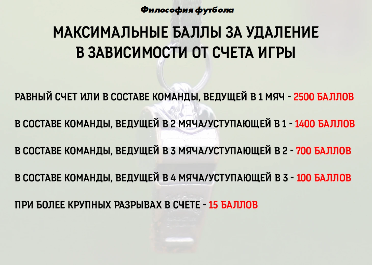Вот и мы и закончили рассчет для всех ошибок, которые связаны с потенциальным голом, они составляют большую часть от всех видов, поэтому осталось совсем немного. К тому же, правила для ошибок, которые потенциально приводят к удалению, гораздо легче понять, ну а за эпизоды в центре поля все совсем просто, разницы между баллами там почти нет, поэтому следующие две группы разберём коротко.