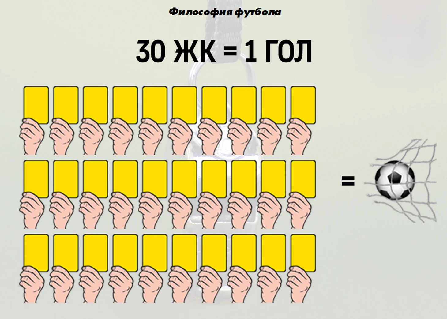 Вот как выглядели все эти проблемы: возьмём баллы за ошибочно (не)засчитанный гол, меняющий исход матча, в начале игры, он был меньше примерно в три раза от максимума и равнялся около ста баллам. В рамках гола все логично - в начале игры он значительно меньше влияет на исход поединка, впереди ещё много времени, чтобы отыграться. Но теперь вспоминаем, что жк весит 35 баллов, разумеется этот максимум был именно в начале встречи, карточка в конце игры особо не влияет на исход. В итоге у нас получается, что один гол равен трем ошибочным желтым в начале встречи, уже совсем недалеко от безумных умозаключений Абаскаля.