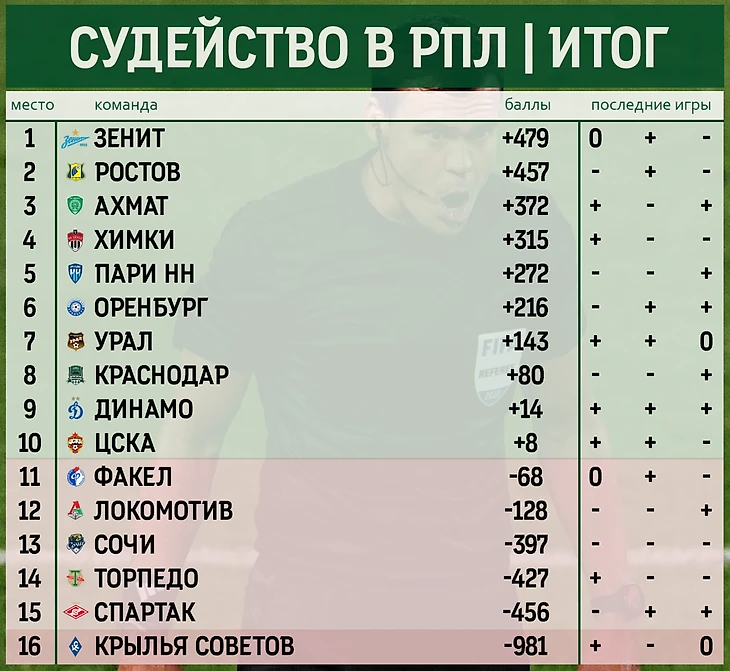 Система подсчёта ошибок имела множество недостатков и противоречий, она не очень точно отражала значимость каждого решения арбитра. Поэтому в обзорной статье об итогах исследования я подчеркивал, что все это - лишь проба пера, бета-версия, воспринимать всерьез ее не стоит. Конечно, итоговая таблица команд по лояльности со стороны судейства отразила некоторые закономерности, например особенно частые ошибки против «Крыльев Советов». Но в целом, сказать что-то по ней было сложно, поэтому те же лидирующие места «Зенита» и «Ростова» (как команд, в чью пользу больше всего совершались судейские ошибки) для меня лишь условность.