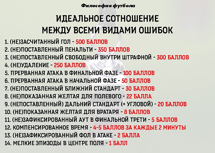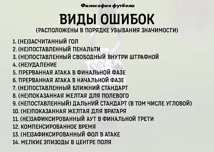 Первый - это сама ошибка, то есть в чем она заключается: в непоставленном пенальти или штрафном, непоказанной красной или жёлтой и тд. Изначально я выделил 10 разных видов ошибок (для сокращения будем называть это так) и расставил их в порядке убывания их влияния на игру. Получился вот такой список: