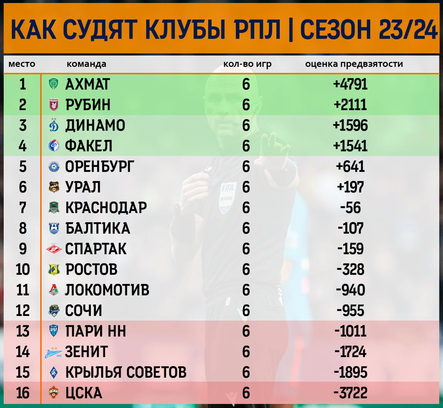 А вот зоны с яркими цветами - это уже заметное подсуживание в одну сторону: минимум 333 балла в среднем за матч и от 10000 за весь сезон. При этом важно понимать, что эта таблица не отражает количество потерянных/приобретенных очков в результате ошибок судей. Тот же ЦСКА здесь в глубоком минусе, причина которого одна - игра с «Ахматом». Но вы же помните, как закончился тот поединок. Поэтому будьте внимательнее, здесь анализируется предвзятость в чью-либо сторону, но количество очков без ошибок арбитров высчитать невозможно, футбол не терпит сослагательного наклонения.