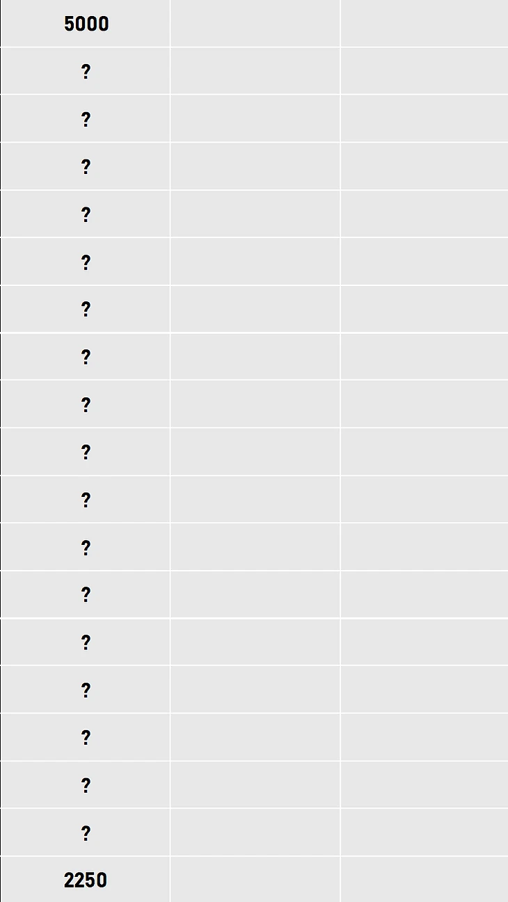 Для расшифровки этих знаков вопроса сначала мы должны посчитать, сколько раз значение должно поменяться на одно и то же число, чтобы дойти с минимального до максимального. Выходит 18 раз, далее простая арифметика: вычисляем общую разницу между минимумом и максимумом, 5000-2250=2750, полученное число делим на 18 и получим разницу между соседними временными отрезками - 152,7777777... Вышло нецелое число, но ничего страшного, просто возьмём 152 и 153, будем их чередовать, в конце все равно накопится небольшой остаток и придется прибавить уже 158, чтобы все сошлось, но эта неточность совсем маленькая. Теперь можно легко посчитать баллы, например берём и прибавляем к минимальному значению гола 152 или 153, получим значение для отрезка на 6-10 минуте, к этого значения прибавляем ещё 152-153 и так далее. В итоге получается такая картина: