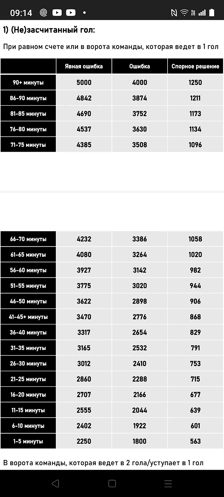 Для мелких ошибок я просто предоставлю вам полную таблицу изменений баллов в зависимости от времени и счета. Здесь отчасти соблюдается принцип с голами: при равном счёте и минимальной разнице баллы к концу матча увеличиваются, а остальных случаях наоборот. Ну и обращу внимание на ещё одну деталь - в новой системе все спорные мелкие фолы в центре поля не учитываются. У меня нет уверенности, что я могу их все отследить, честно говоря, иногда моментов в центре поля было так много, что некоторые возможные нарушения я пропускал, из-за чего могла возникнуть непоследовательность. Учитывая, что это лишь спорные решения в центре поля - говорить об их влиянии на исход матча глупо, поэтому я решил оставить только ошибки.