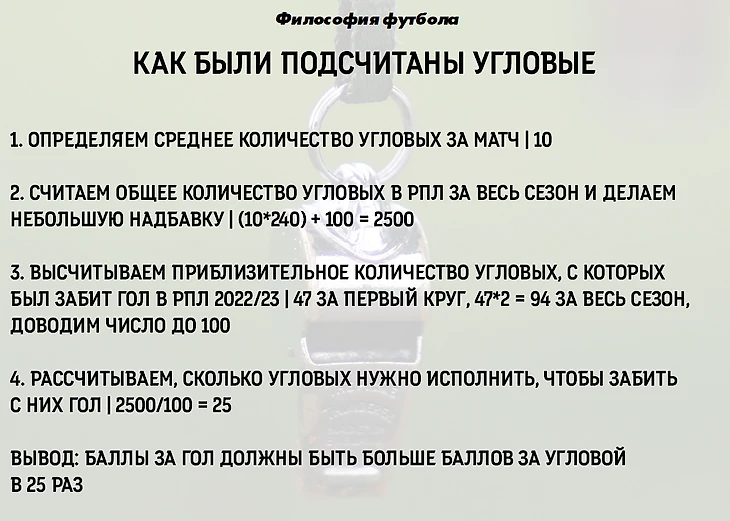 В нашем чемпионате проводится 240 игр, умножаем их на 10 и получаем примерное число угловых, исполненных за весь сезон (2400). Можем накинуть ещё 100 угловых, учитывая атакующие тенденции в нашем чемпионате, итого 2500. Теперь нужно посчитать, сколько из этих двух с половиной тысяч стандартов завершились голом. Я решил упростить себе эту задачу и отмониторил лишь первую часть сезона, думаю, этого вполне достаточно, чтобы иметь общее представление о том, как часто реализуются угловые. Вам может показаться, что статистику вытянут те самые убийственные розыгрыши стандартов от «Урала» с Газинским на дальней штанге, но на деле с угловых забивали многие, за полсезона накопилось аж 47 голов. Отмечу, что к ним я относил случаи, когда после угловых назначался пенальти (и он был реализован), а также вторую волну атаки, если мяч быстро возвращался обратно в штрафную, после чего следовал гол. Далее увеличиваем количество голов с угловых в два раза и получаем число 94, которое так и тянет округлить до 100, особенно учитывая, что до этого мы накинули сотню лишних угловых. В итоге получается идеальная ситуация для подсчёта: 2500 угловых, из которых 100 привели к забитому мячу. Делим 2500 на 100 и получаем 25 - именно столько угловых могут в среднем привести к одному голу. Таким образом мы выяснили, во сколько раз баллы за гол должны быть больше баллов за угловой, и это уже не просто абстрактные умозаключения, а данные, основанные на реальной статистике, хоть и с разного рода округлениями и допущениями.