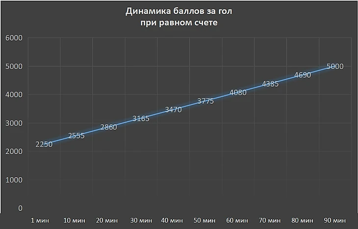 Все остальные «голевые» ошибки также должны снижаться в 2,2 раза, баллы в начале встречи таким образом составляют 45 процентов от баллов в конце. Если гол на 90+ минуте равен 5000 баллам, то нам нужно вычислить 45 процентов от этого числа, чтобы получить гол в начале. Получится число 2250, оно является минимумом, который можно получить за гол при равном счёте. Значение будет увеличиваться постепенно, прямо как указано на графике ниже: