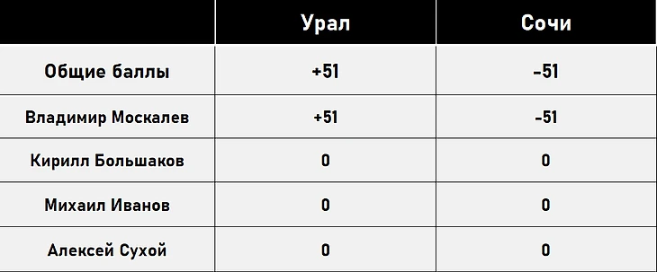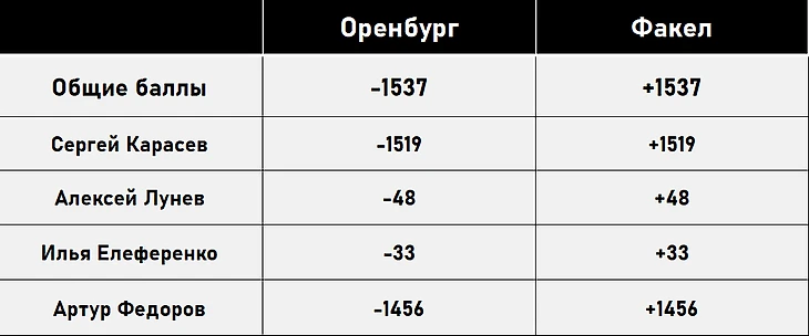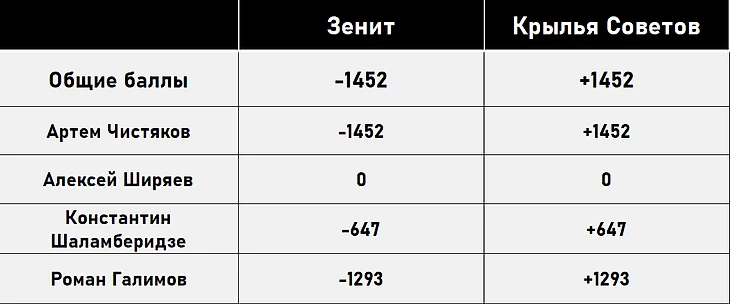 Теперь наконец-то переходим к итоговым баллам, которые не отразились на результате, но разумеется «Зенит» справедливо может быть недоволен отсутствием красной Рахмановичу, которое вкупе с мелкими ошибками дало почти полторы тысячи баллов в сторону самарцев, претензий нет только к Алексею Ширяеву на бровке.