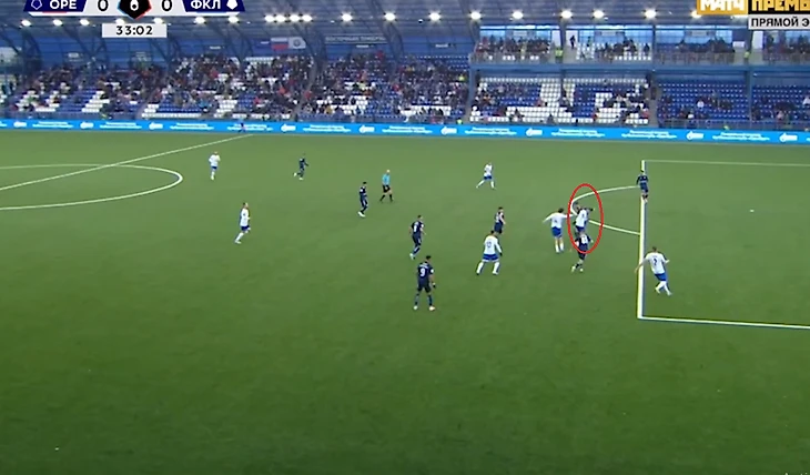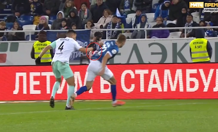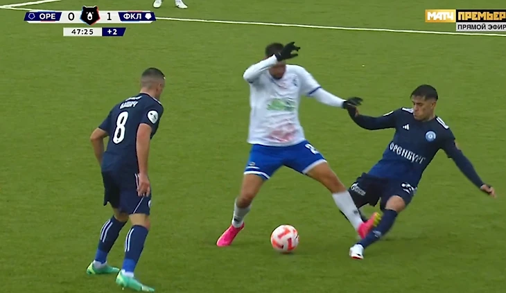 Но переходим к грустному: в добавленное к первому тайму время Марков уже сам нарушил правила, неудачно попытавшись укрыть мяч корпусом. Эпизод продолжился атакой «Оренбурга», а Карасев чуть позже показал лишь жёлтую карточку. Стоп-кадр выглядит угрожающим: