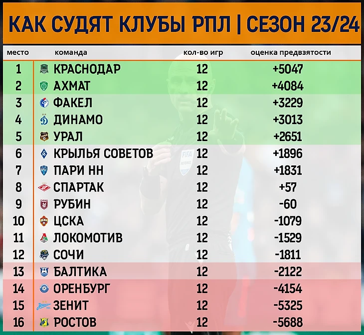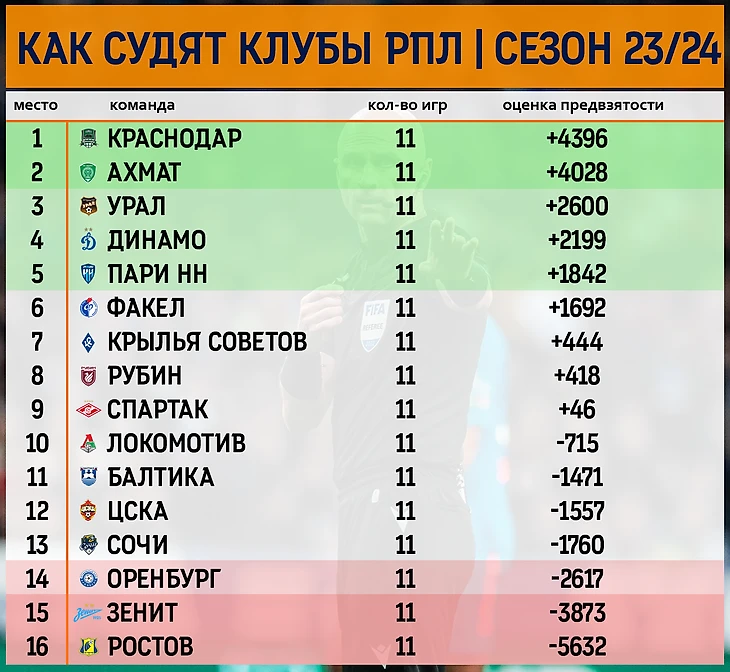 Вы могли обратить внимание, что практически в каждой игре судьи допускали значимые ошибки в одну сторону. Это разумеется отразилось на таблице предвзятости: теперь сразу три команды находятся в красной зоне. На текущий момент именно «Ростов», «Зенит» и «Оренбург» больше всего страдают от судейства, причем с большим отрывом. Любопытно, что двое из этой тройки в прошлом сезоне заняли первые два места по выгоде от ошибок арбитров, пусть и система подсчета тогда была совсем другой.