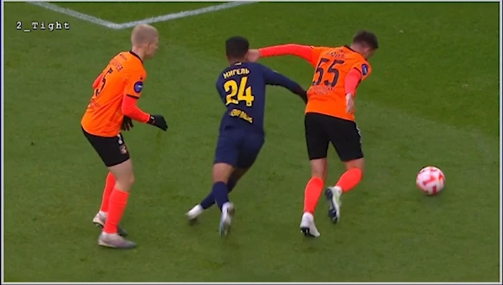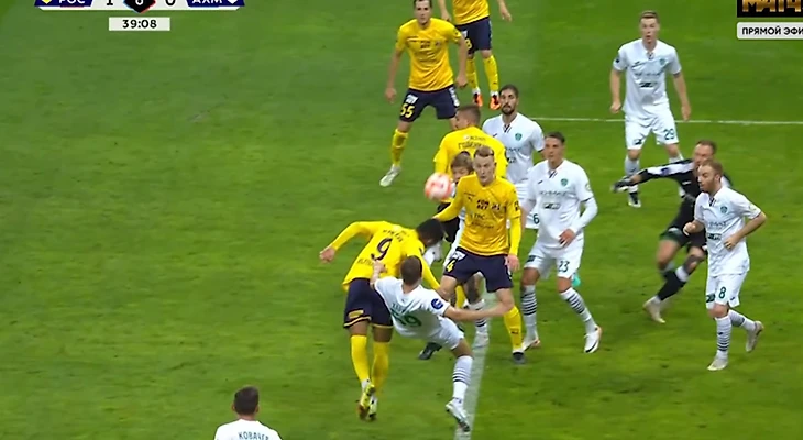 Сам эпизод на самом деле любопытный: обычно такие попадания шипами случаются в попытке отобрать мяч, а здесь банальная неуклюжесть едва не привела к удалению. Конечно «неуклюжесть» не равно «фолу по неосторожности», критерии для красной здесь есть: прямая нога, попадание шипами в незащищённую область, ещё и продавливание со сломом. Явная ошибка в пользу «Факела», за которую воронежцы получили плюс 1456 баллов.