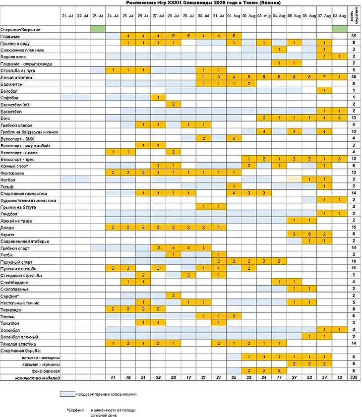С 23 июля по 8 августа в Токио выступят около 11000 спортсменов из 205 национальных олимпийских комитетов. Они разыграют 339 комплектов медалей в 33 видах спорта – академической гребле, бадминтоне, баскетболе, софтболе, боксе, борьбе, велоспорте, водном поло, плавании, прыжках в воду, синхронном плавании, волейболе, гандболе, гольфе, гребле на байдарках и каноэ, спортивной гимнастике, прыжках на батуте, художественной гимнастике, дзюдо, каратэ, конном спорте, легкой атлетике, настольном теннисе, парусном спорте, регби-7, серфинге, скейтбординге, спортивном скалолазании, современном пятиборье, стрельбе, стрельбе из лука, теннисе, триатлоне, тхэквондо, тяжелой атлетике, фехтовании, футболе и хоккее на траве.