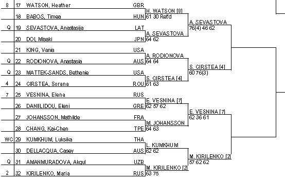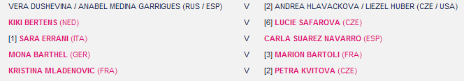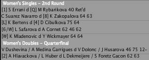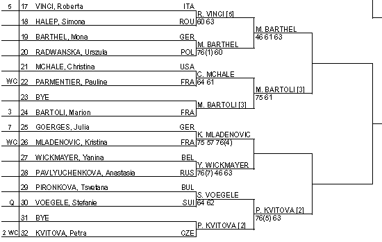Думаю, в 1/2 будут либо Бартоли-Квитова, либо Бартель-Младенович. Сомневаюсь, что победитель турнира будет из верхней половины сетки.
