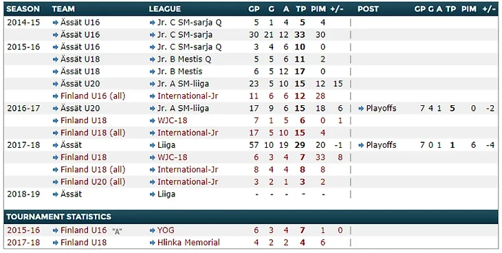 В свои 17 лет Йеспери уже провел полноценный сезон в финской Liiga со взрослыми мужиками. За 59 игр он набрал 29 (10+19) очков и заработал всего лишь 20 штрафных минут. После окончания сезона, начал феерить за юниорскую и молодежную сборные Финляндии.