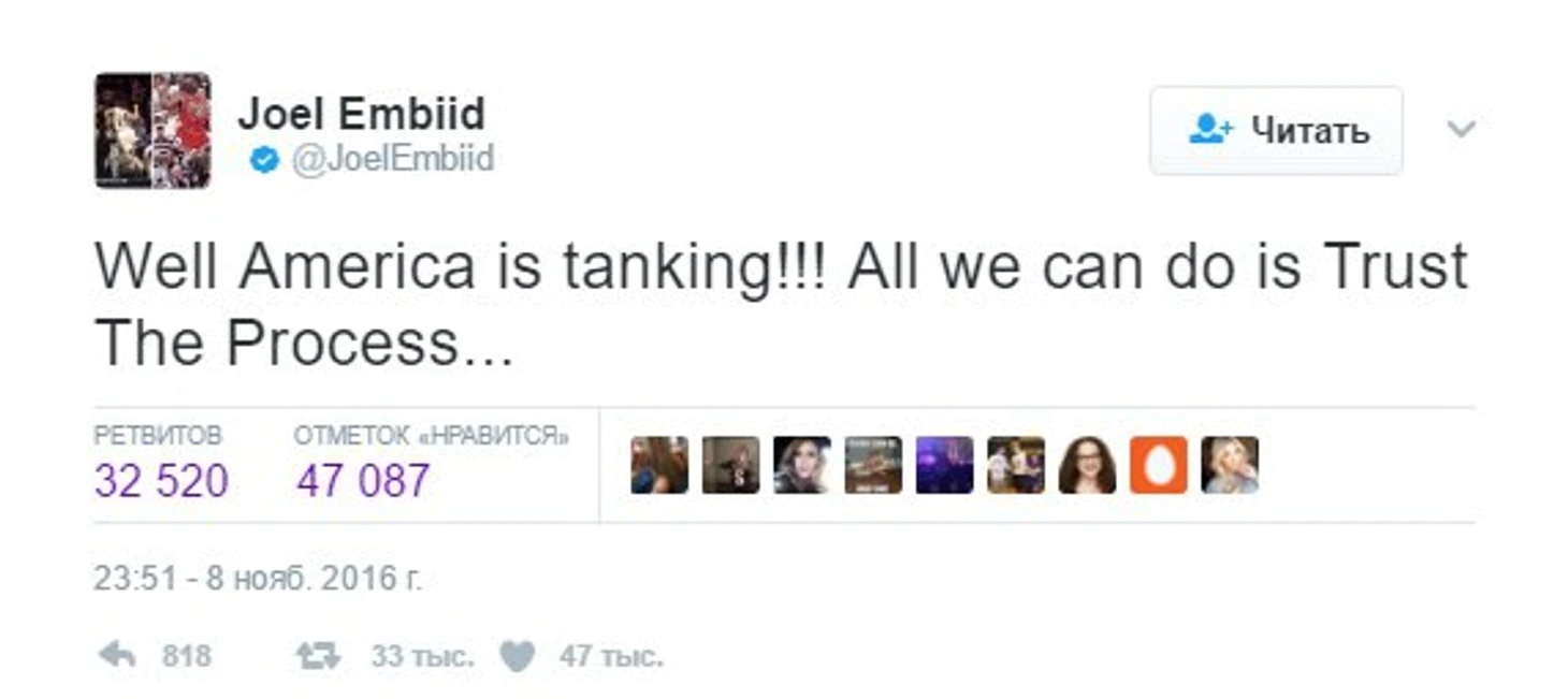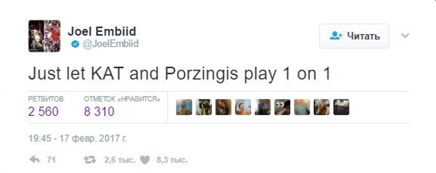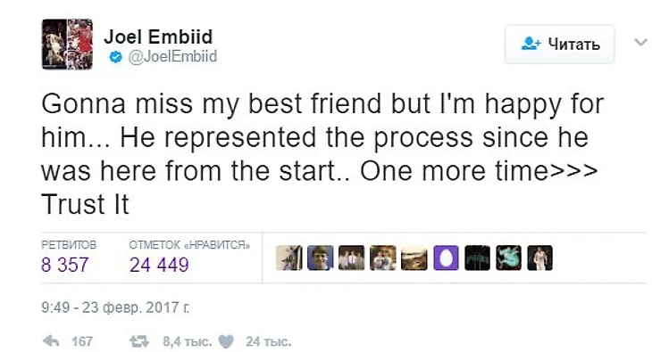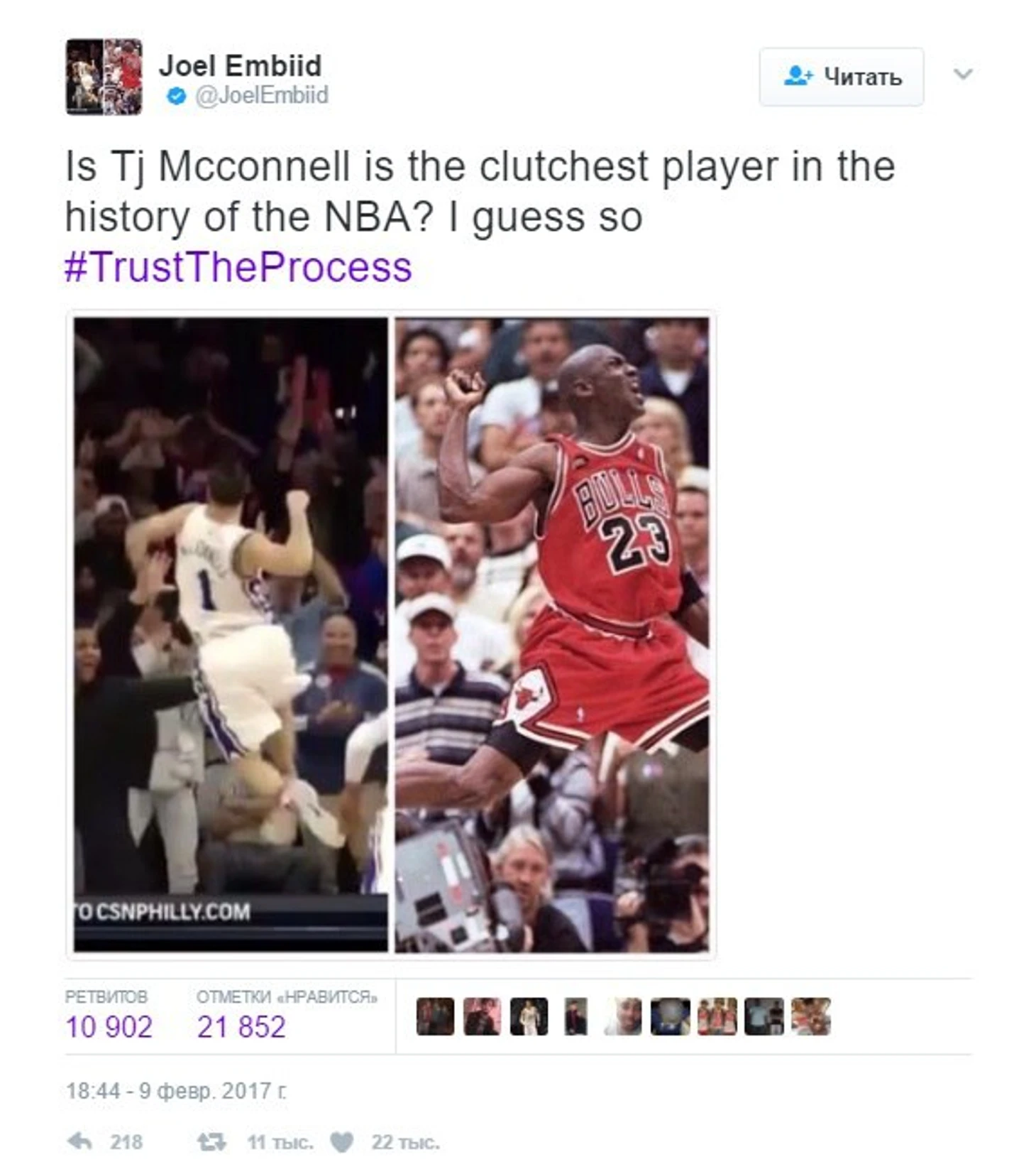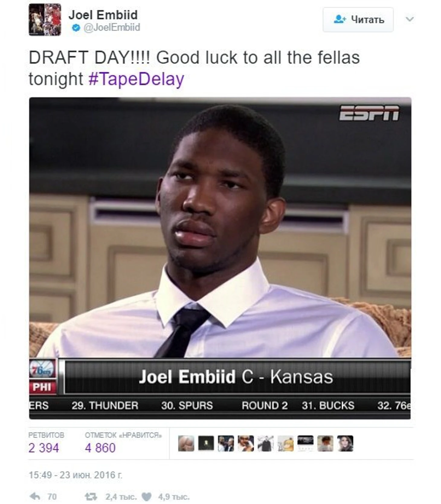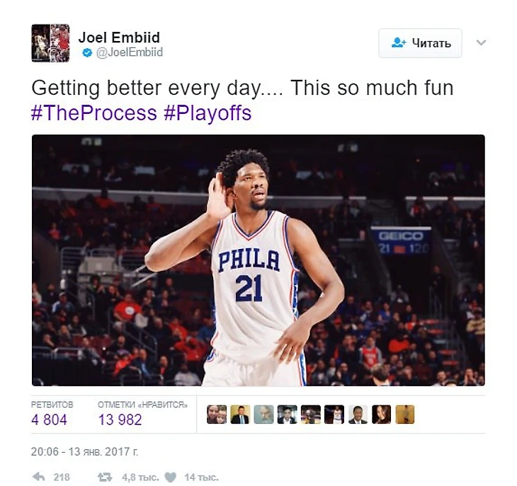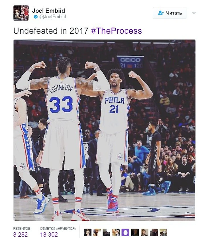 Эмбиид спасает нас от рутинных событий НБА. От однотипных интервью. Каждый день люди ждут не только 20+10 за треть часа, но и уморительных перфомансов «Процесса» вне площадки. Уже сейчас Эмбиид медийная звезда. Я не могу представить себе человека, которого бесят выходки Эмбиида. Его невозможно не любить. Он обладает хорошим чувством юмора и самоиронией. Он может пометятся над собой или безобидно подшутить над коллегами по цеху. Заблокировать твиттер Леброна, просто потому что он не перешел в «Филадельфию». Рассказывать всем, как он уложил льва голыми руками. Если бы Эмбиид, а не Кайри, сказал, что Земля плоская, все бы просто посмеялись и оценили шутку. Он сам себе построил храм всеобщей любви. На выездных матчах «Фили» публика болеет за него.