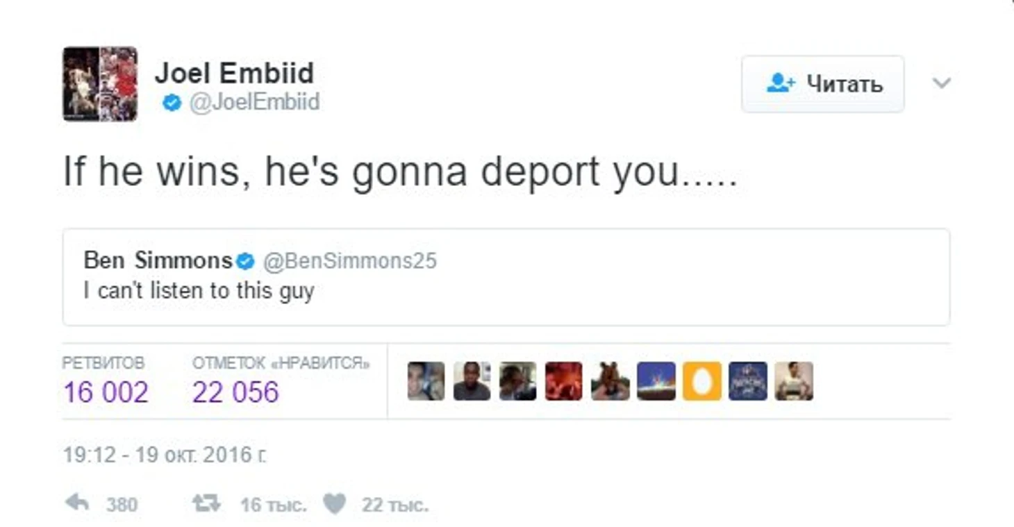 Пугает Бена Симмонса депортацией из страны, в случае победы Трампа