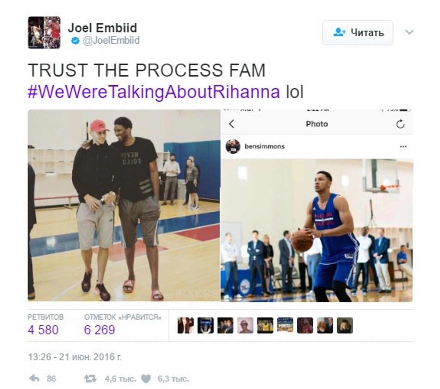 За спиной каждого великого мужчины стоит не менее великая женщина. Эмбиид в поисках этой самой женщины. Одна из сестер Кардашьян попросту проигнорировала Джоэля, а он, в следствии такого недружелюбного акта, заблокировал её. Дела с Рианной вовсе туманны. Остается искать запасные варианты.