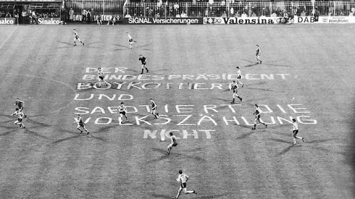 «БОЙКОТИРУЙТЕ И САБОТИРУЙТЕ ПЕРЕПИСЬ НАСЕЛЕНИЯ» – ночью на стадион пробрались противники предстоявшей в ФРГ процедуры и белой краской выразили свой протест. Через 11 часов должен был начаться матч «Боруссия» – «Гамбург», который транслировался по телевидению.