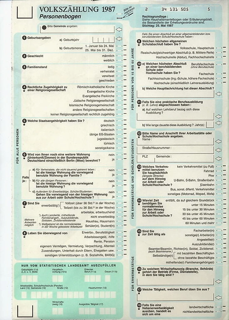 Необходимо сделать пояснение: участие в переписи населения в ФРГ, при которой граждане заполняли внушительных размеров формуляры с большим количеством вопросов, было обязательным. Государство регулярно проводило ее, чтобы лучше понимать социальный состав общества, как развивать инфраструктуру, в том числе транспортную, более точно оказывать социальную помощь. В послевоенное время перепись населения проводилась в Западной Германии в 1950, 1956, 1961, 1970 и 1987 годах.