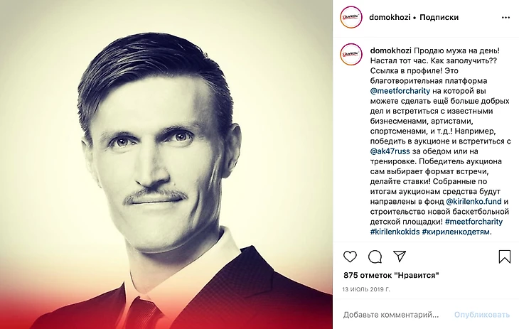 «Продаю мужа на день! Настал тот час. Как заполучить?? Ссылка в профиле! Это благотворительная платформа @meetforcharity на которой вы можете сделать еще больше добрых дел и встретиться с известными бизнесменами, артистами, спортсменами, и т.д.! Например, победить в аукционе и встретиться с @ak47russ за обедом или на тренировке. Победитель аукциона сам выбирает формат встречи, делайте ставки! Собранные по итогам аукционам средства будут направлены в фонд @kirilenko.fund и строительство новой баскетбольной детской площадки! #meetforcharity #kirilenkokids #кириленкодетям».